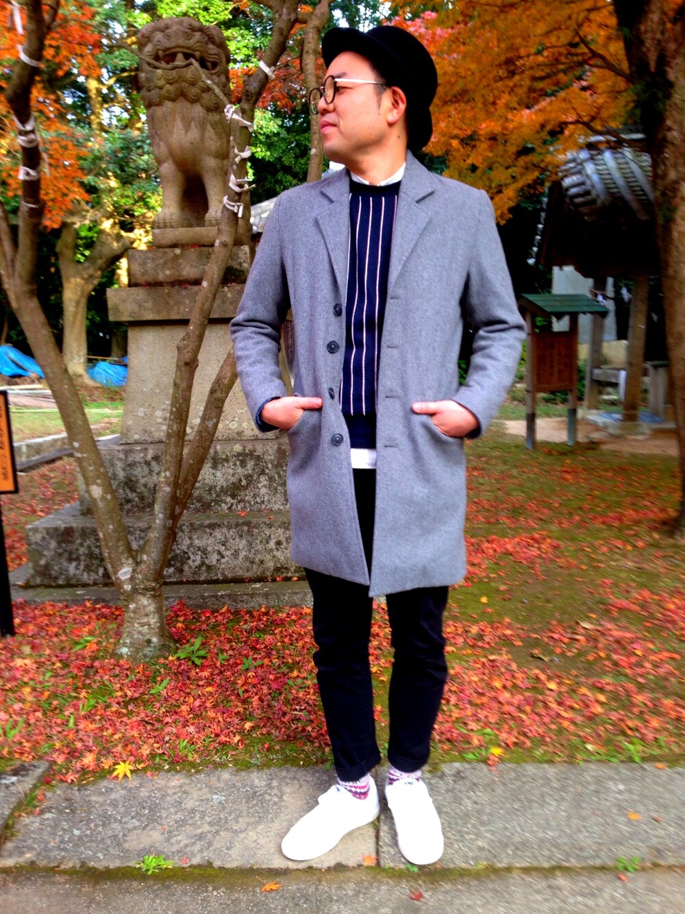 息子の七五三に、地元の神社でパシャリ。ボーラーにチェスター、ホワイトスニーカー。おっさんなりのキレイめコーデで😁