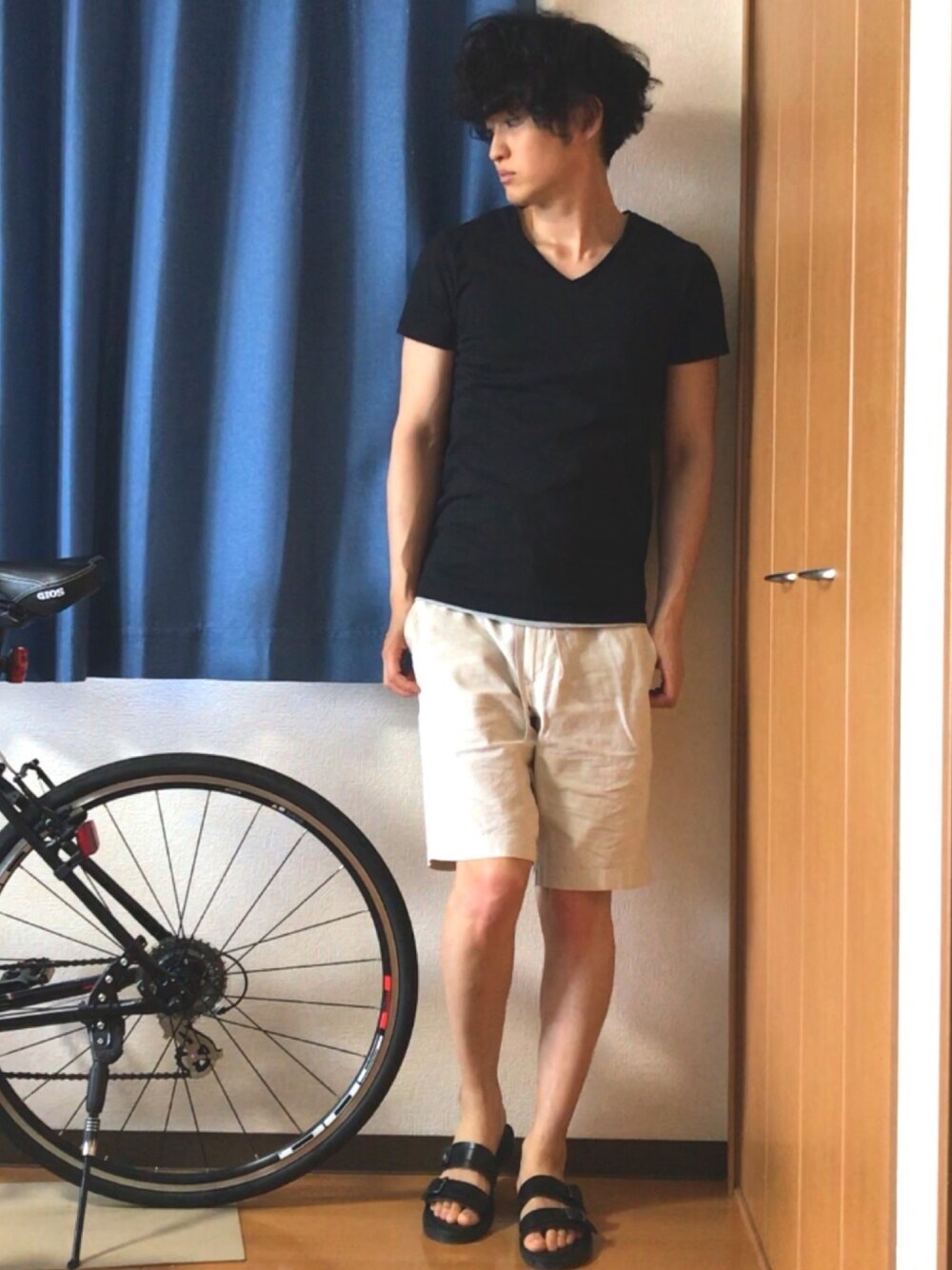 閲覧ありがとうございます! 黒のVネックカットソーに生成色のハーフパンツ。足元はレザーサンダルです! 良かったらいいね、save、フォローお願いします!(`・ω・´)