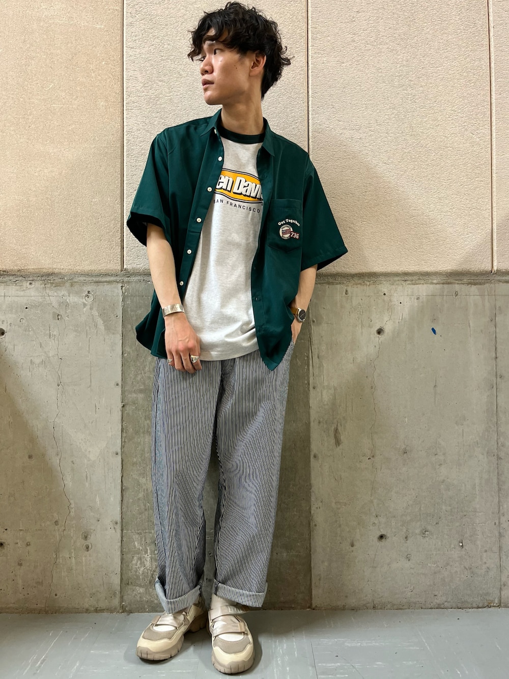 ☆刺繍開襟シャツ☆ 存在感ある刺繍開襟シャツ🔥バックのプリントはレトロ感、今やトレンドでもある古着テイストさもあり1枚で旬な着こなしに🤘太いパンツで合わせるのがイマドキ😉サラッとした生地感で、暑い夏でもガシガシ着てもらえます!今の季節はロンTをレイヤード◎ロングシーズンで使えます✌️(178cm:トップスLサイズ、ボトムLサイズ)