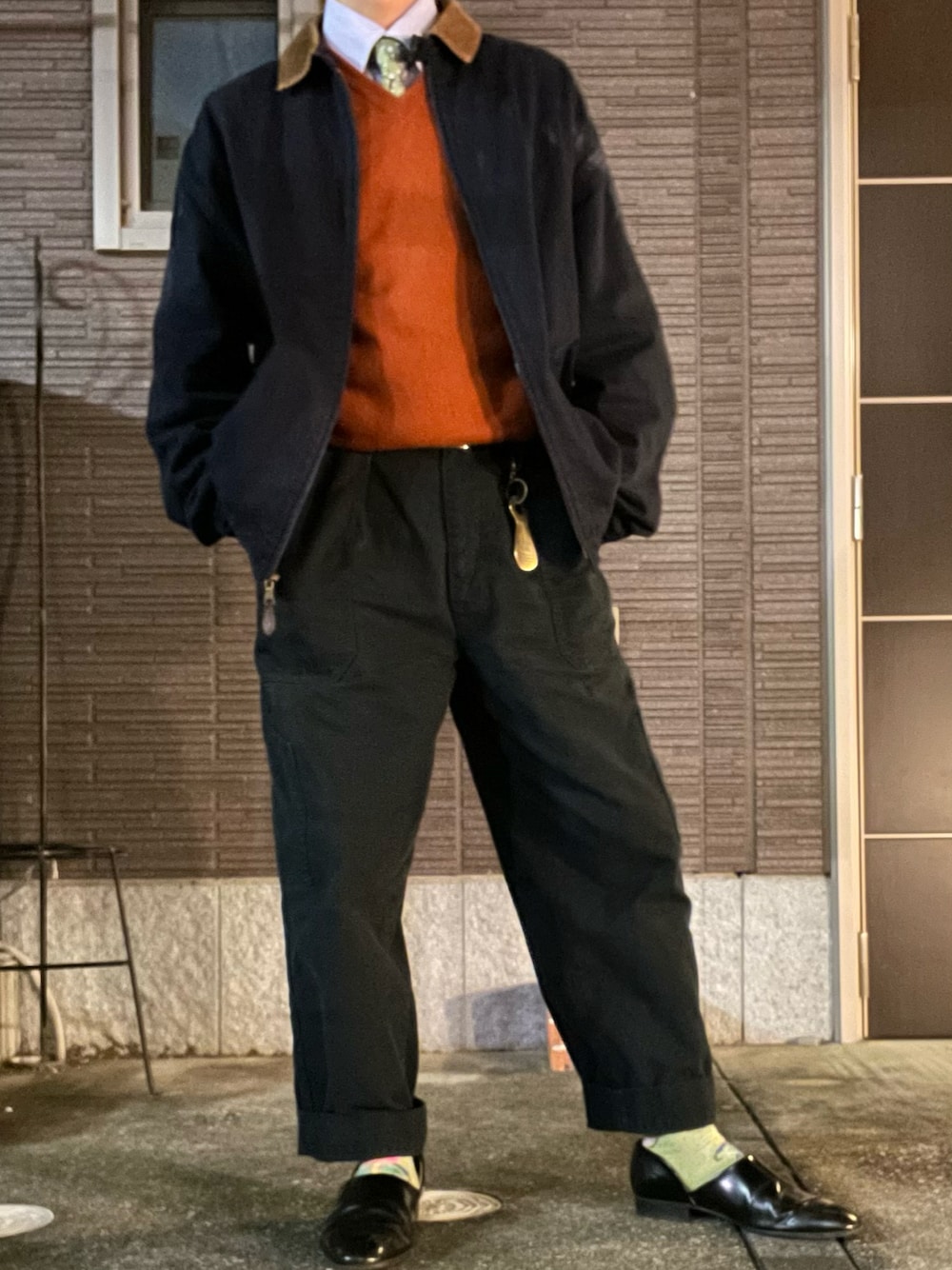 古着のオレンジのセーターがいい感じに映えてますね!ジャストサイズなのでどう着るかにいつも悩まされてます笑 あとはネクタイとソックスで色味を寄せていくことで統一感を出すことを意識しました! パンツをロールアップすることでソックスのチラ見せも忘れずなかなかお気に入りコーデです笑