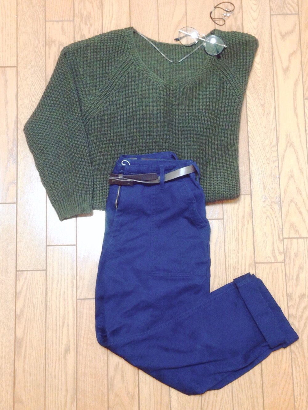 バイトに行くだけなのでかなりゆるっとした格好です笑 VネックニットはGUです! ちょっと寒かったので着てみました 👗 バイトは制服があるので着替えやすくシワにならない服になってます(笑)