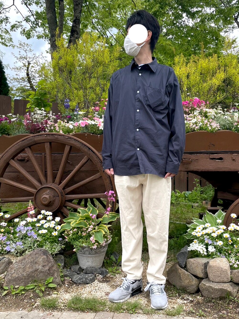 今日はシンプルなシャツスタイル! に白デニムのバルーンパンツで。 ボタニカルガーデンにて。