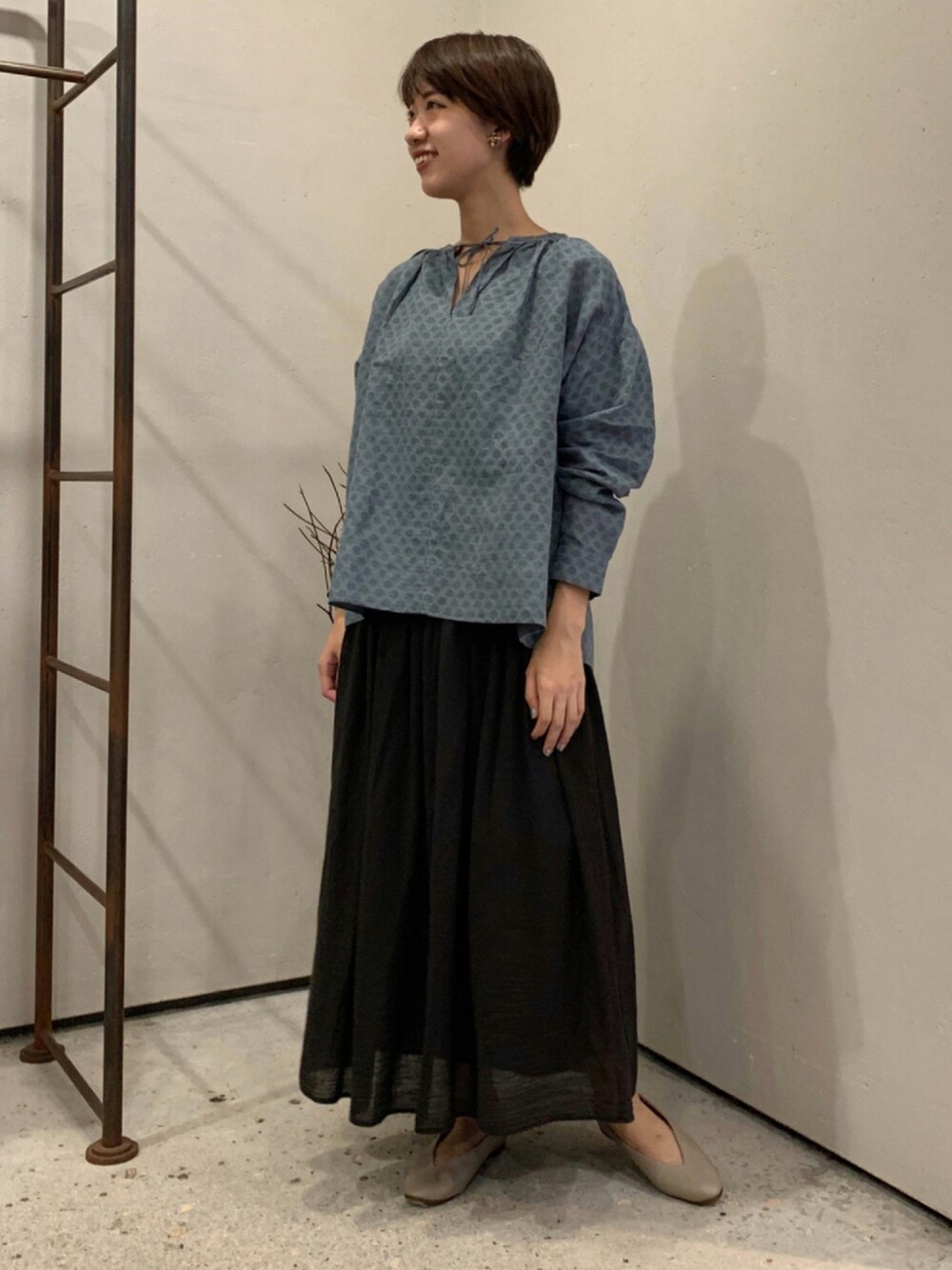 かぐれのアイテムでナチュラルなコーディネート。 どちらも落ち着いたお色展開で、秋を見据えた今にぴったりの雰囲気です! 足元はキレイめに、女性らしくまとめてみました◎