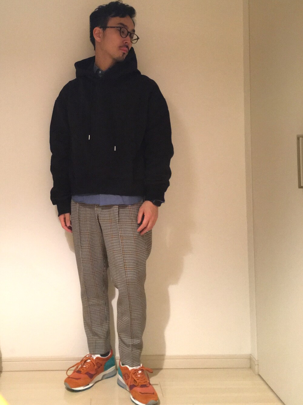 ブラック系のパーカーを着用したメンズの冬コーディネートの1枚目の写真