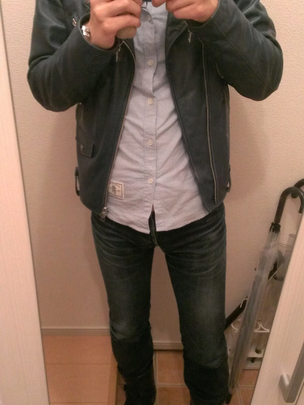 ブルーコーデです。 もうそろそろ革ジャンで外に出るのは辛い。。