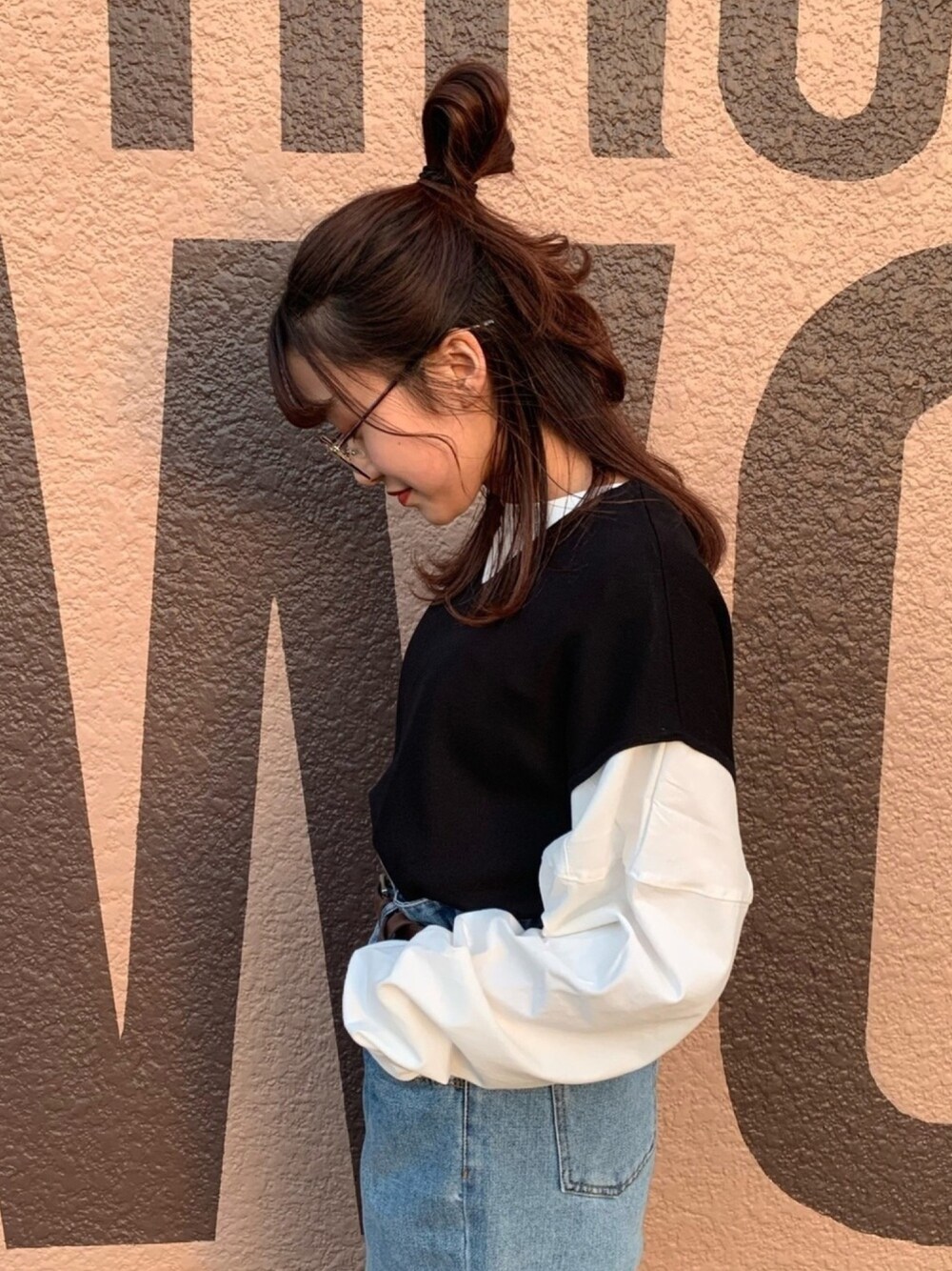 . オーバートップスに 薄めのニットベストを 合わせてボトムにイン🌈 メンズライクなちょっと 韓国風コーディネートに🇰🇷''