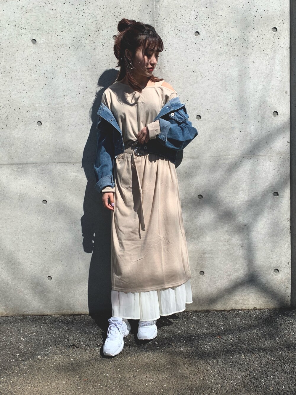 . ワンショルダーで ヘルシーに肌見せ😊 ワンピースにプリーツ スカートをレイヤード💐