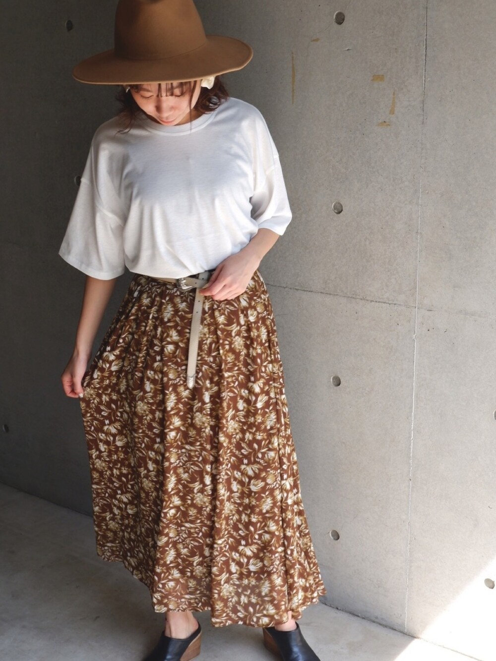 . ボタニカルスカートにシンプルな Tシャツ合わせで初夏を感じさせる コーディネートに🌿"