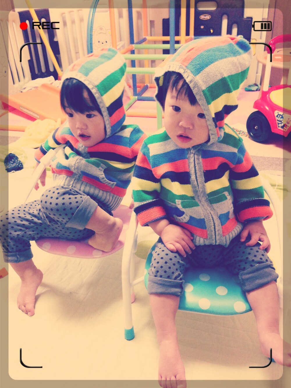 フードをかぶってこびとちゃん風。 三人でお絵かきタイム٩(♡▽♡ )۶