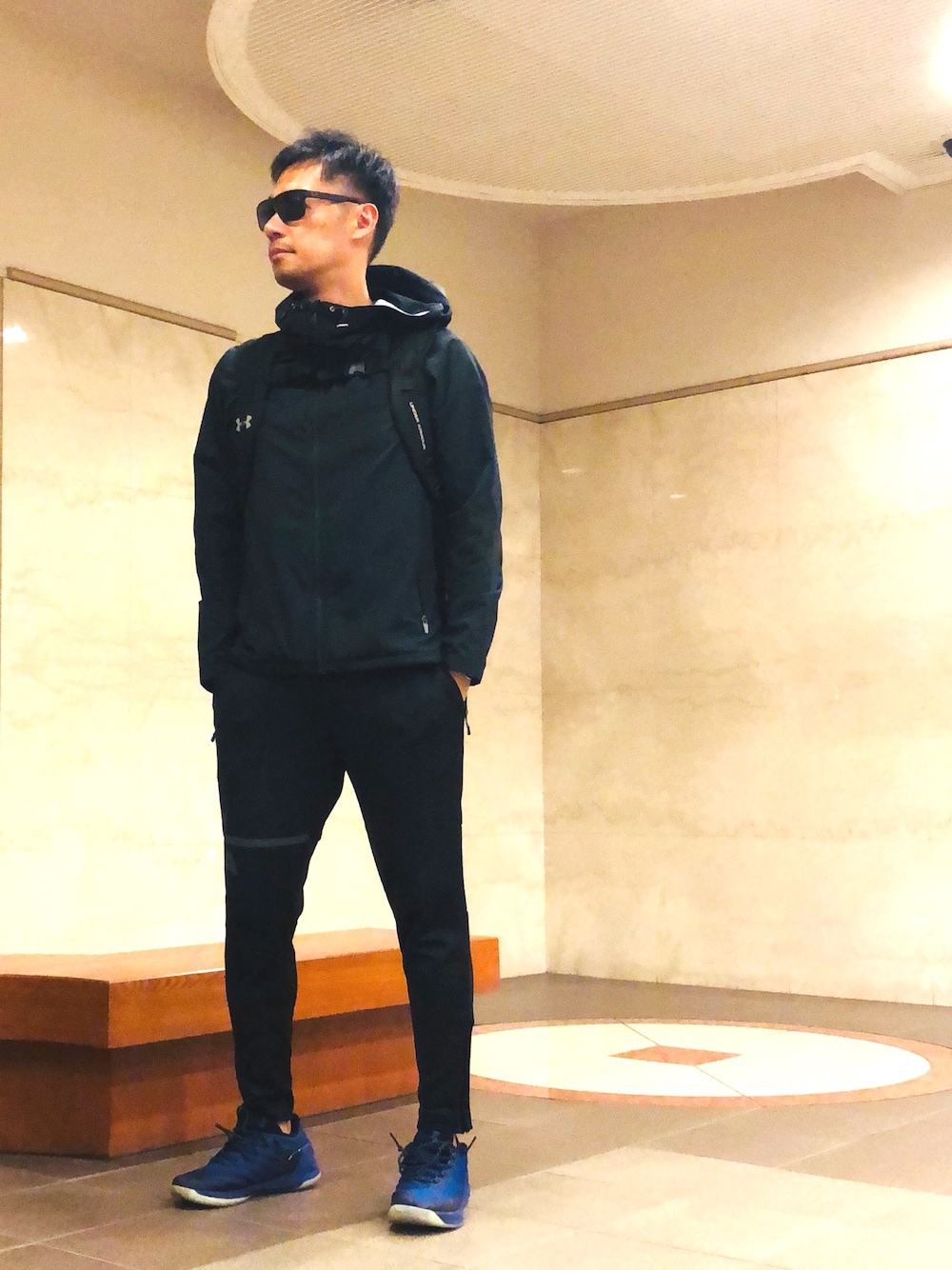 久しぶりにバスケへ⛹️♂️ 全身ほぼ真っ黒だけどスニーカーだけ色をチョイ足し! トップスがシャカ系ならボトムスはスウェットみたいに、スポーツミックスは上下で素材を変えるのが好き。