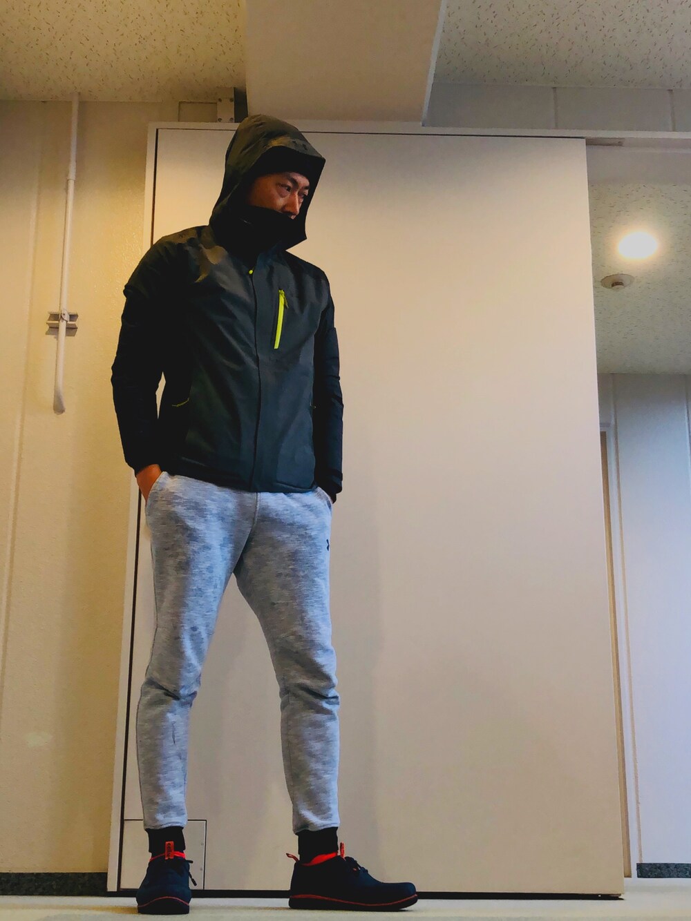 昨日の雨☔️ ワンポイントのネオンイエローに、ツーポイント目のネオンオレンジ…と、雨対策で色がとっちらかっちゃったスタイル🌈 ジョガーがカモフラージュ柄に見えるけど、🚲乗って雨に濡れてるだけ😢