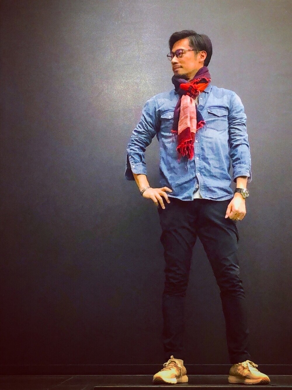 デニムシャツにブラックのトラックパンツ。 そして今日は忘れなかったストールを🧣