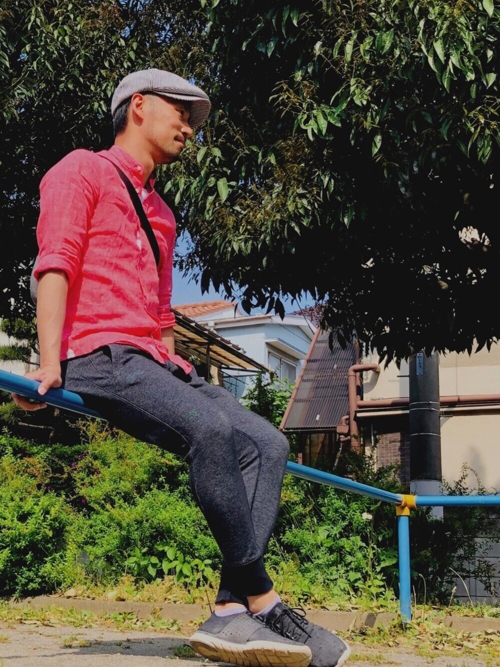 息子二人を連れたおじさんの公園コーデ。 今日は全員ピンクで!(小窓参照)