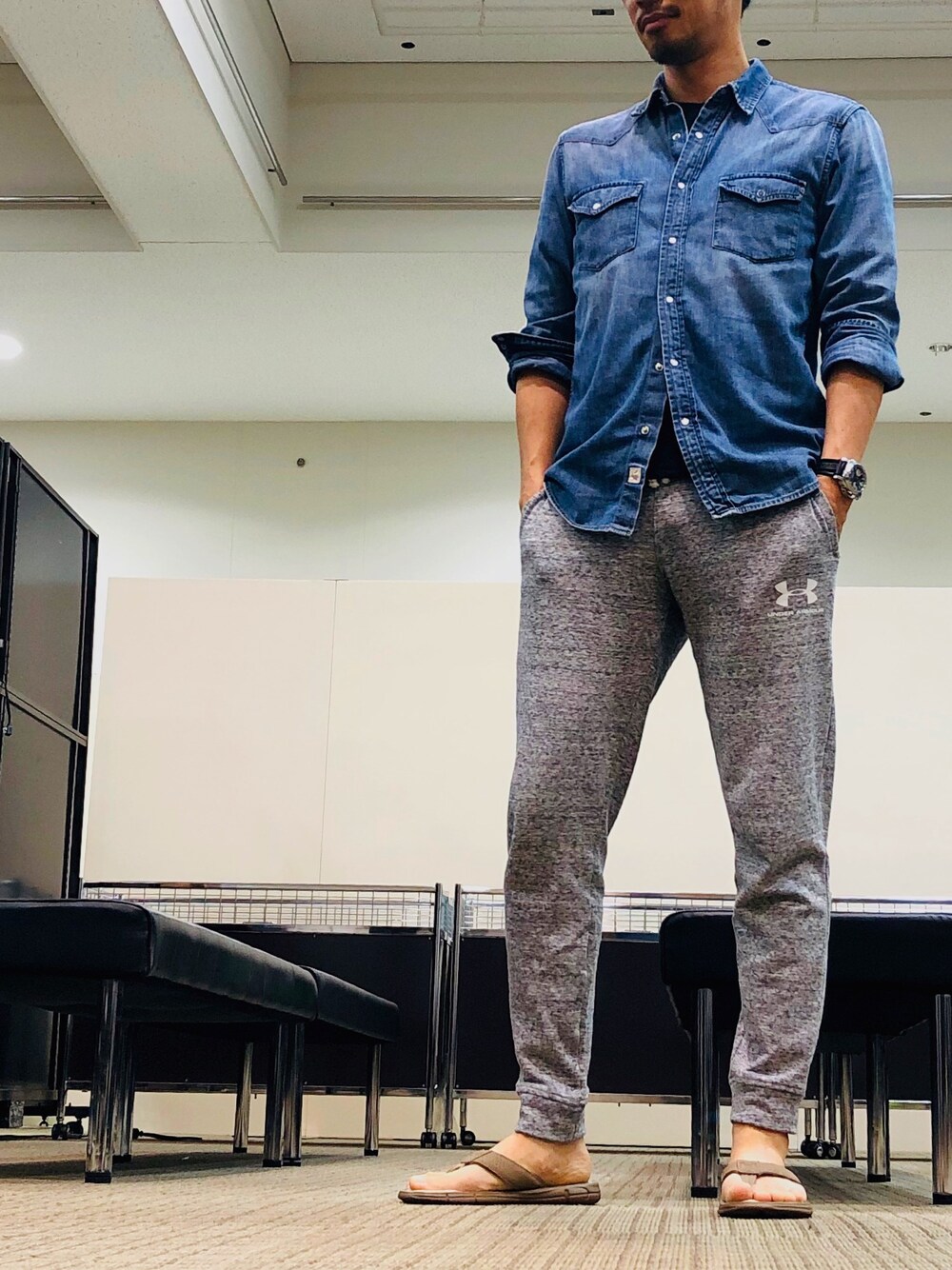出張終わり。 写真は出張中に撮影したけど、疲れでクマが半端ないので…。 デニムシャツにはブラックパンツかオリーブグリーンのミリタリーパンツを合わせることが多いけど、今日はちょっと夏っぽくライトグレーのジョガーパンツを。 というわけで2回目のフェス参加!