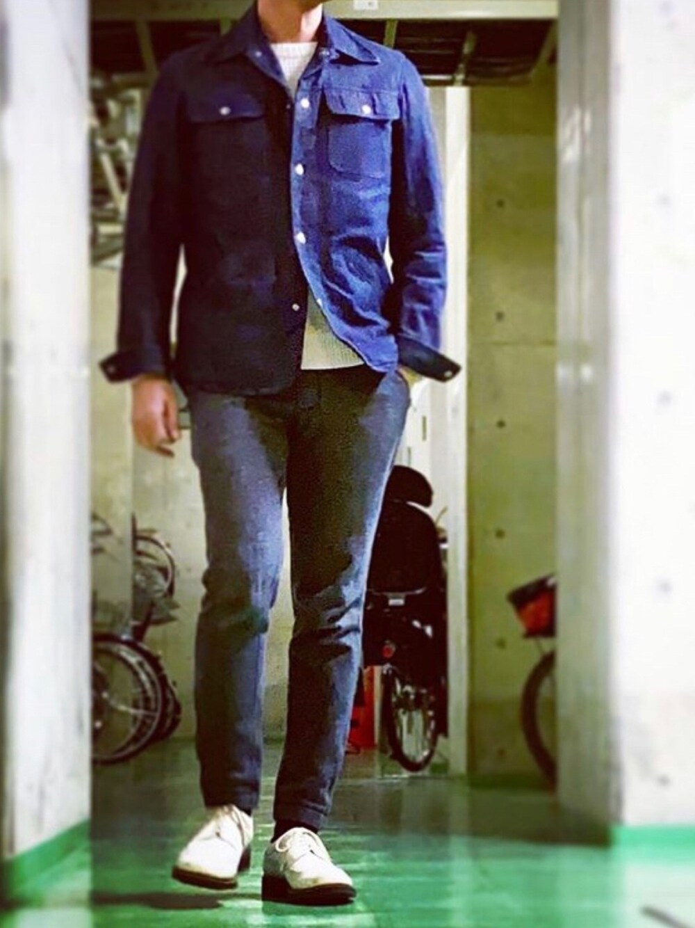 デニムのカバーオールはコテコテのカジュアルアイテムだけど、ワンウォッシュの落着きとグレーパンツとのミックスで大人っぽくした……つもり。