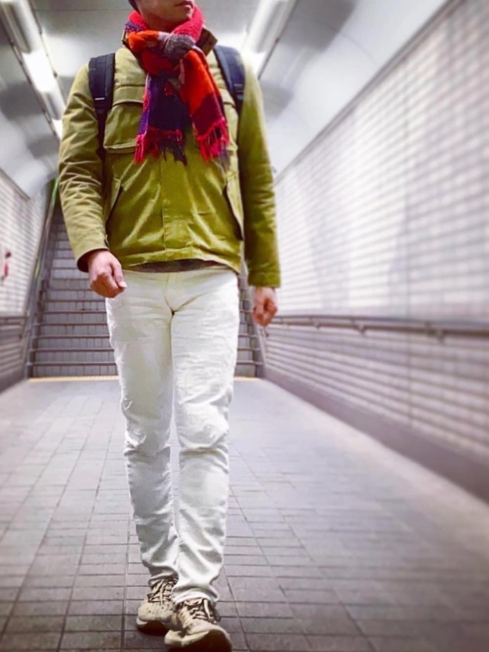 昨日アップしたのと同じジャケット、同じパンツ、同じシューズ。 鮮やかな彩りのショールを追加するだけでだいぶ違う印象になるよね。 あと首元に視線を持ってくることで足長効果も期待!
