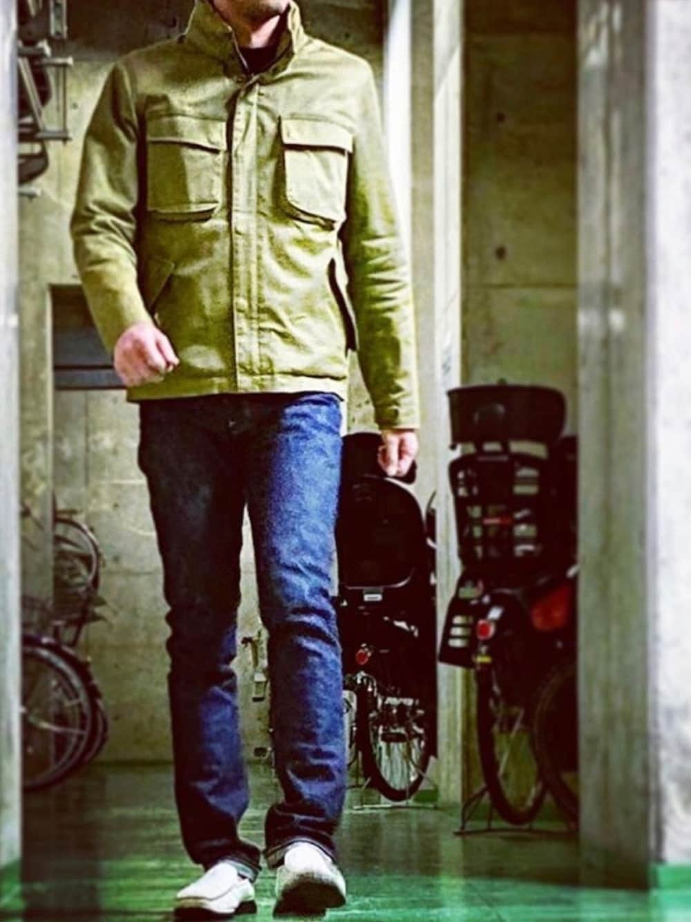オリーブグリーンのM65にリジッドデニム そのままだとラギッド過ぎてしまうので、足元はホワイトのローファーでキレイめに締めてみた