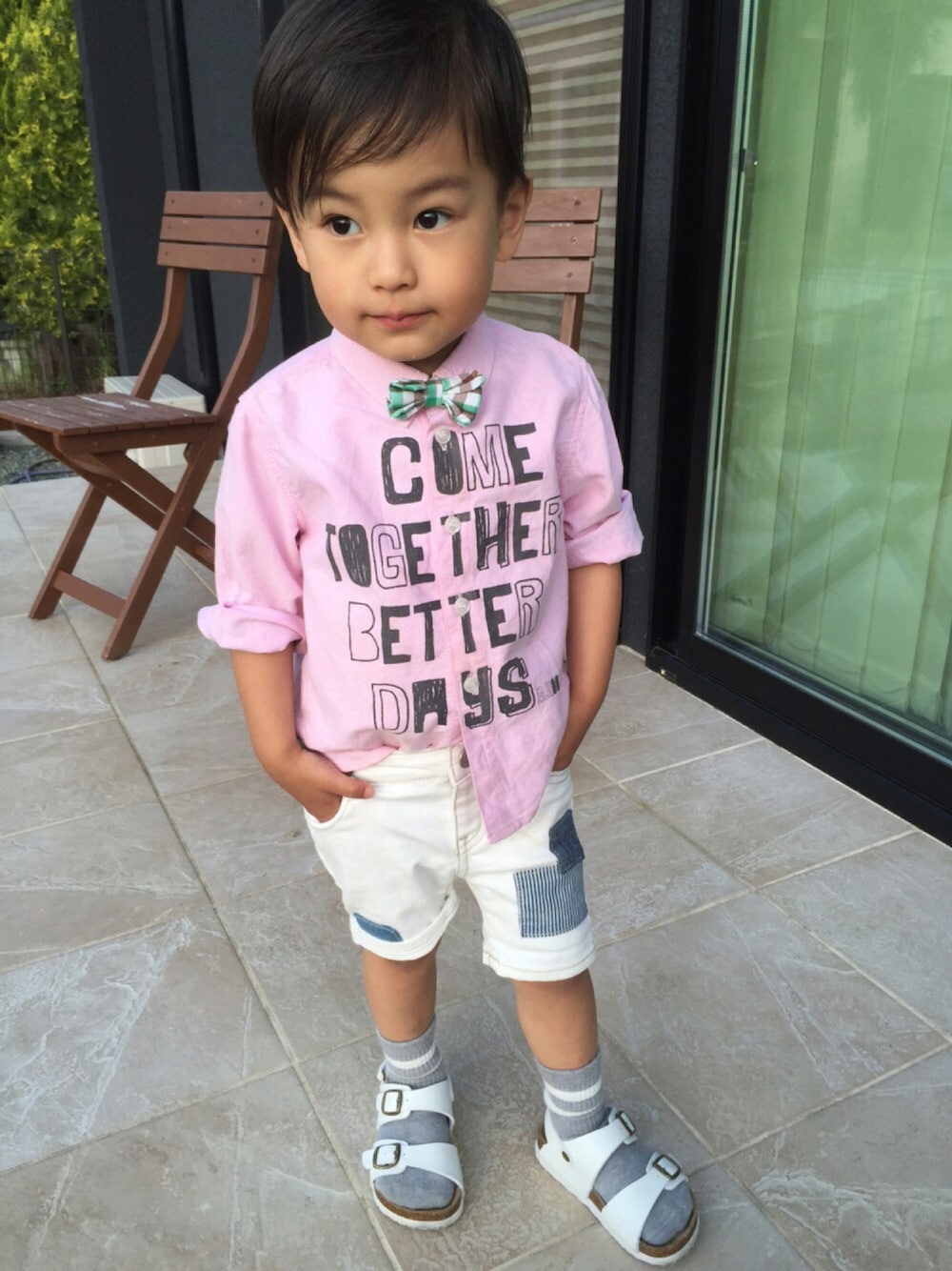 いつも見てくれている方、初めて見てくれた方、ありがとうございます😄💗 今日はうちの子供ドラフト最終コーデです😁 ピンクのボウタイ付きシャツにガールズ用の白ホットパンツです💕 サンダルにソックスはパパの頃流行りました💦 もう来ないと思いましたが、今も可愛いですね💖