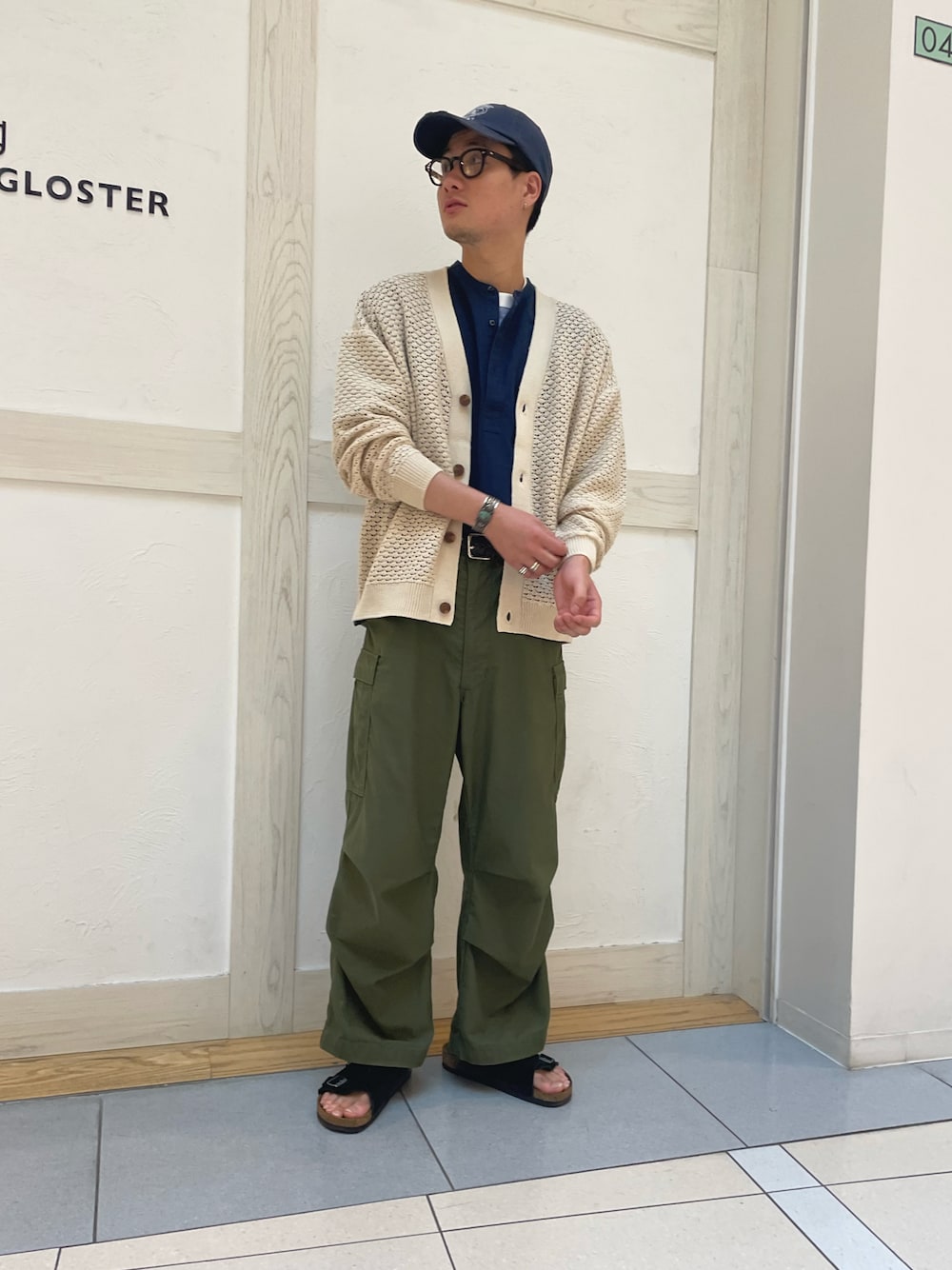 今年トレンドクロシェ網のカーディガン。 インナーにはスリーピングシャツを彷彿とさせるシャツに、ボーダーTシャツ。 軍パンにサンダルで抜け感プラス。