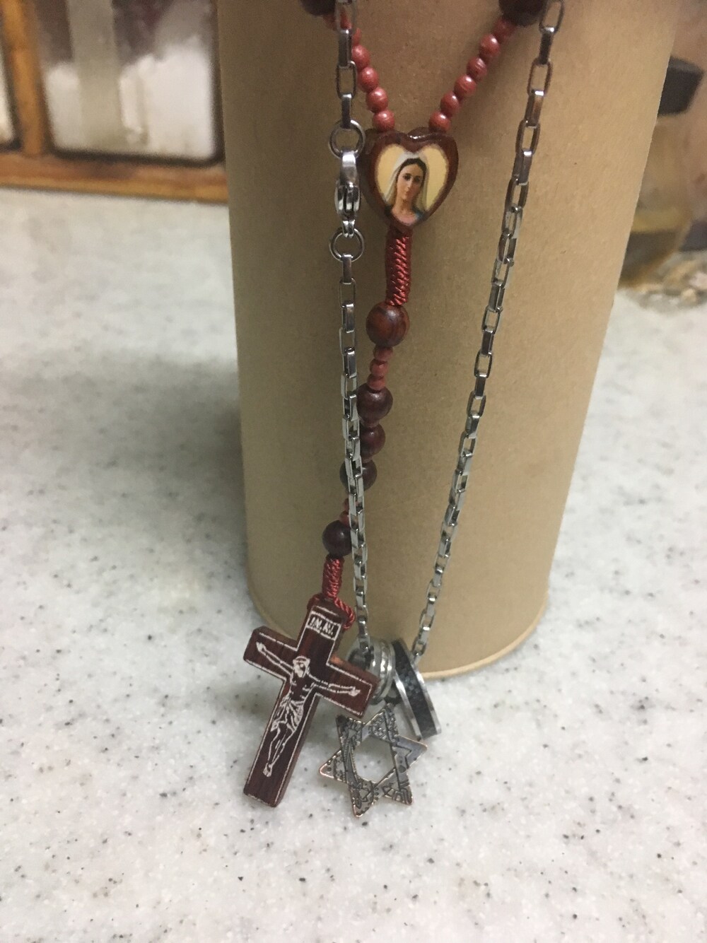 ユダヤ教が使う六芒星をペイズリー柄で、キリスト教の十字架を手作りのロザリオでつけております。多宗教と言うわけではなく全ての人が同じ人間。ということを主張したい為にあえてつけています。 ロザリオは珍しく十字架にキリストが書いてあり木製で出来ています。 ScommaGのダミエ柄のリングをBLOOMのネックレスに付けております。 ロザリオとBLOOMのネックレスにSubcietyの六芒星ネックトップ・ScommaGのダミエ柄リングをつけた 計2点で構成しています。