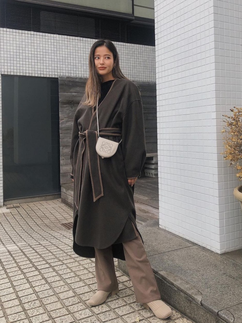お気に入りのニットパイピングコートCoordinate🍂 ダークブラウンにブラウンパイピングの 微配色がすっごくかわいいオススメコート🤎 ゆったりしたシルエットで下にニットも着やすくて ベルトありなしで雰囲気も変えられて、ほんとにオススメです🤎 Director(佐野真依子):162cm