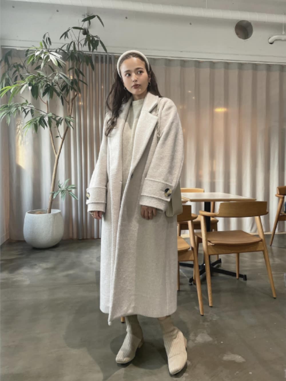 全身、ホワイト系のカラーでまとめた クリスマス意識の大人フェミニンコーデ💞 Director(佐野真依子):162cm