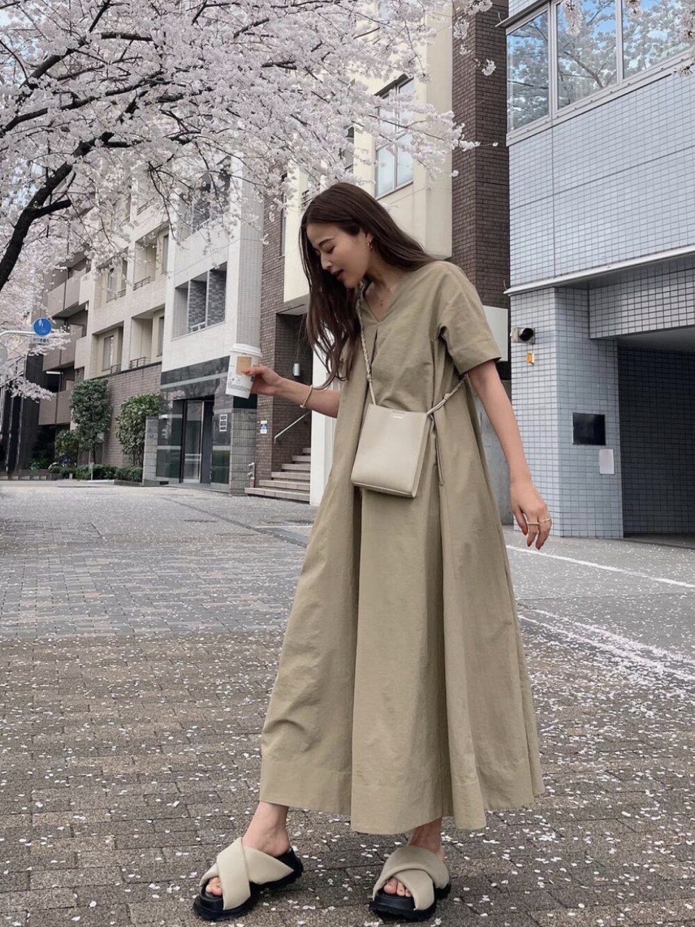 シャカシャカハリハリ生地が めっっっちゃかわい大好きな楽ちんワンピースを着たよ🌸 歩くたびシャカシャカなナイロン生地がめちゃくちゃかわいいんだ🤍 綺麗なフレアシルエットで ゆったり楽ちんだから マタニティさんにもオススメ🤍 カジュアルにはもちろん、 小物によってパーティーや結婚式などのオケージョンにも活躍する1着です🤍