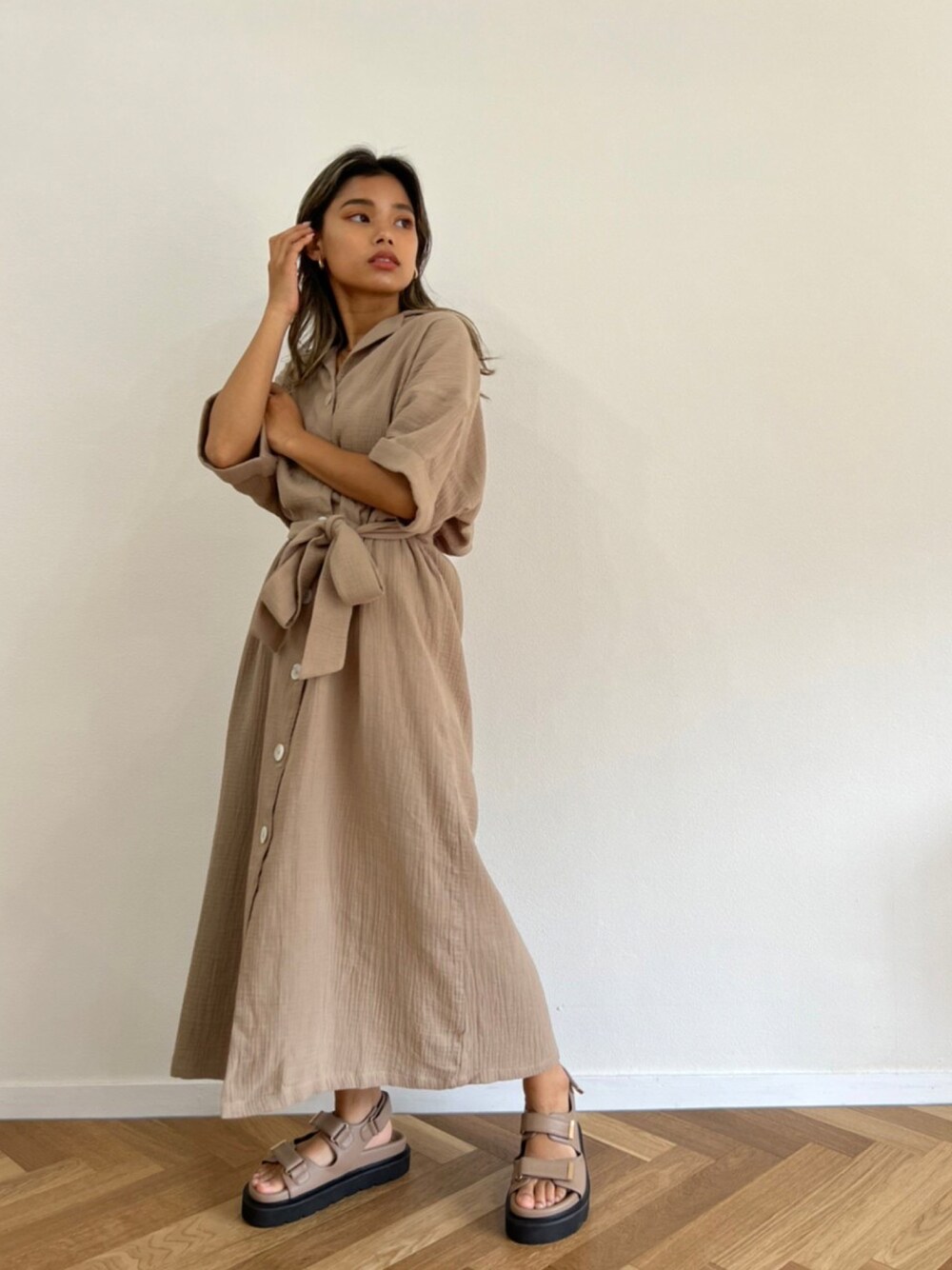 ベージュ系のワンピースを着用したレディースの夏コーディネートの1枚目の写真