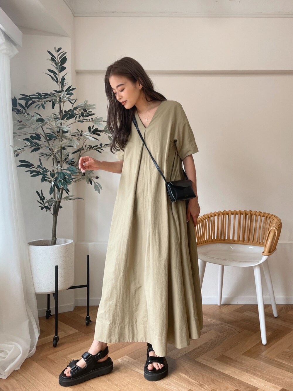 ベージュ系のワンピースを着用したレディースの夏コーディネートの1枚目の写真