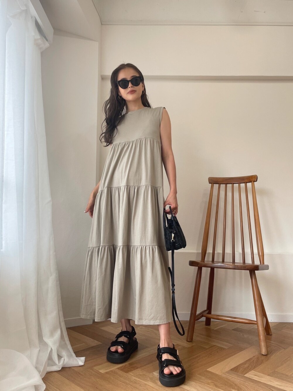 ベージュ系のワンピースを着用したレディースの夏コーディネートの1枚目の写真