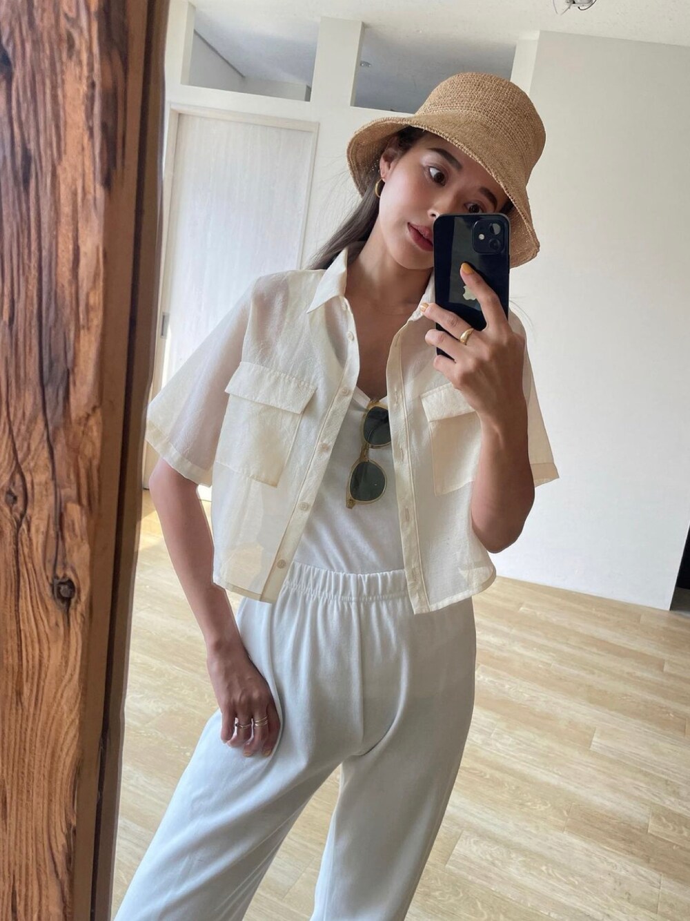 ホワイト系のシャツ/ブラウスを着用したレディースの夏コーディネートの1枚目の写真