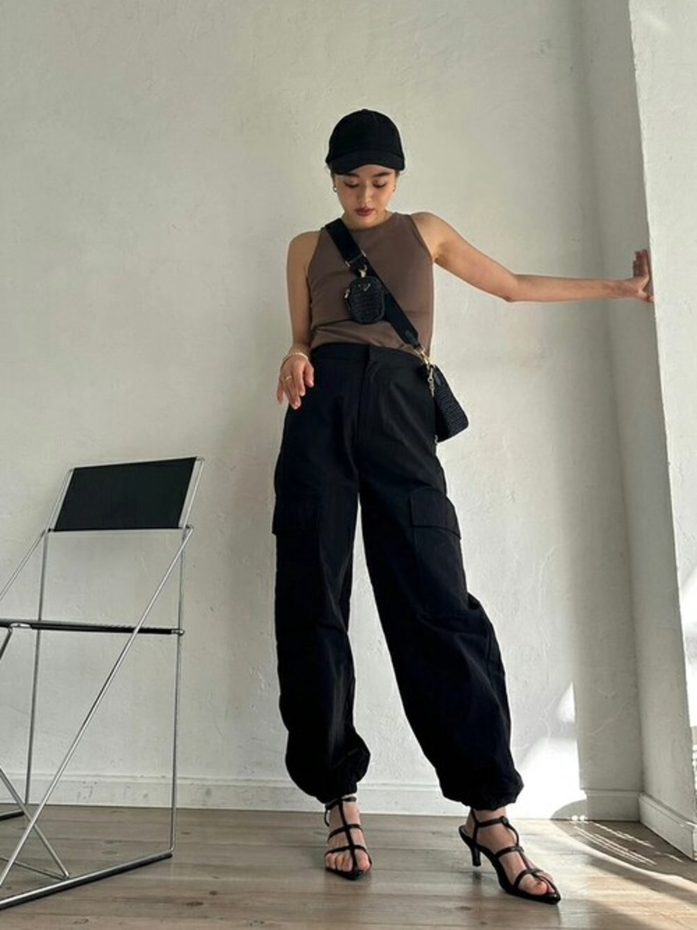 ブラック系のカーゴパンツを着用したレディースの春コーディネートの1枚目の写真
