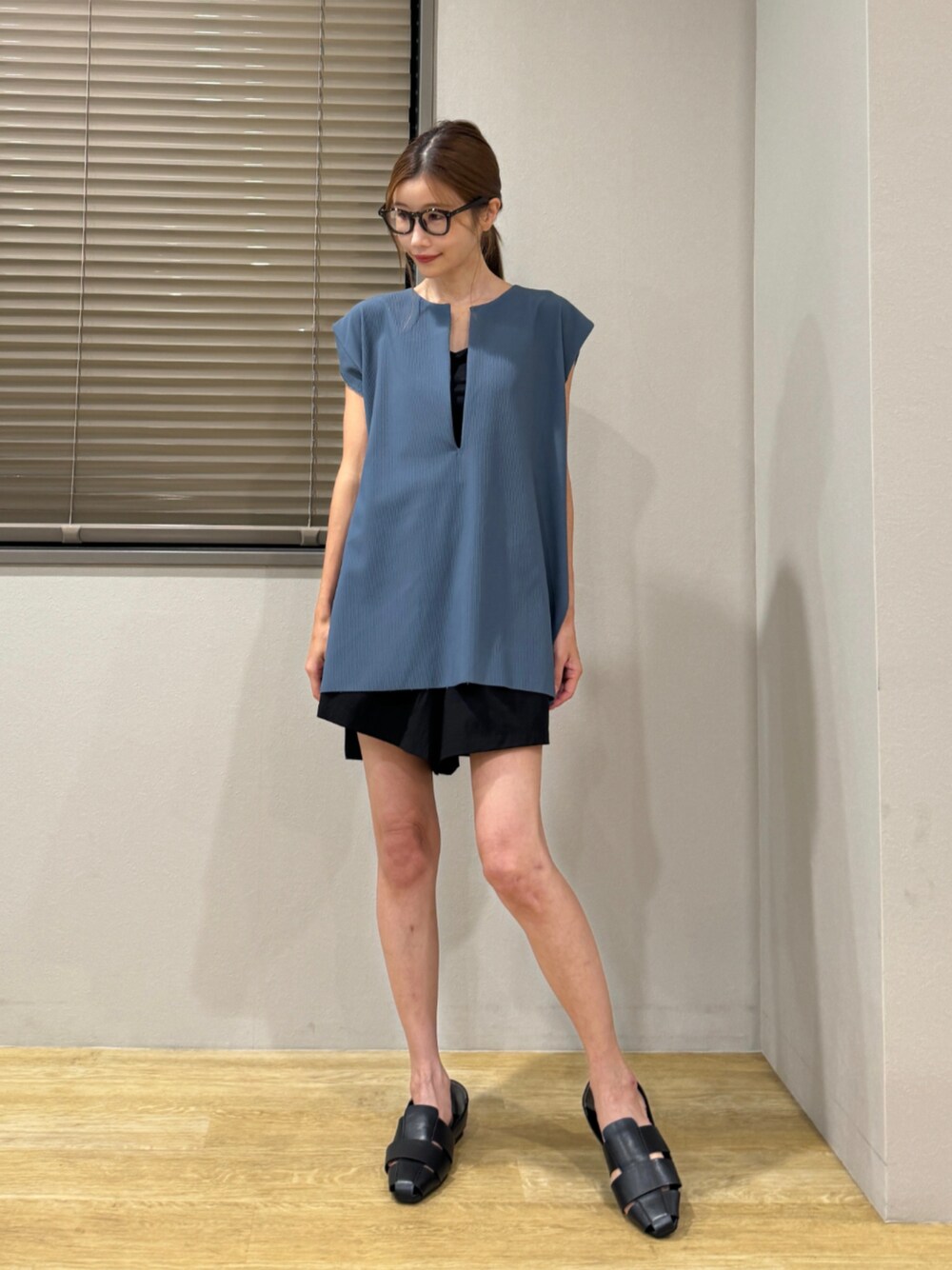 ブルー系のベストを着用したレディースの夏コーディネートの1枚目の写真