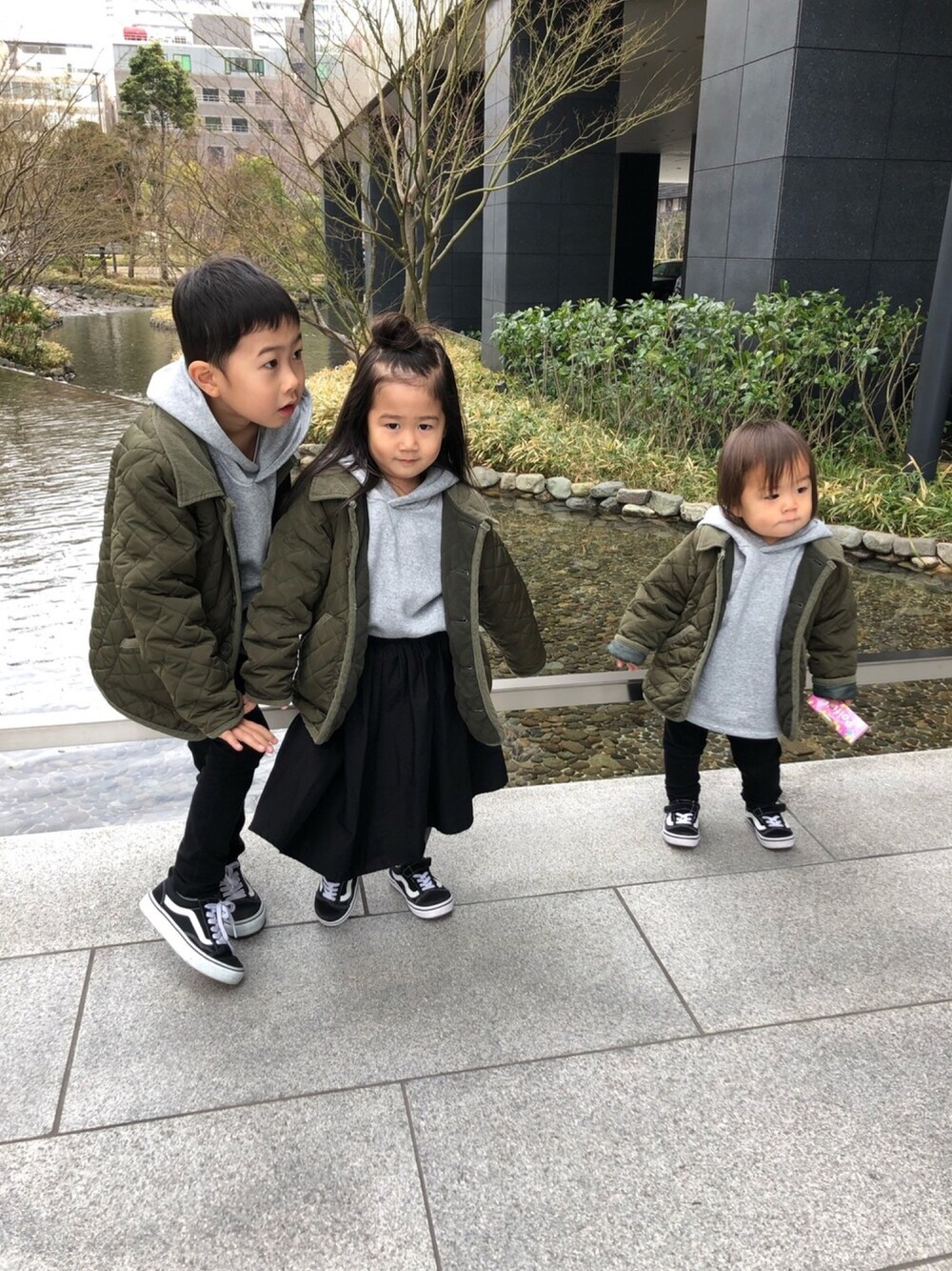 ACTUSプロデュースのスーホルムカフェで☕️🍰 グレー×カーキ×ブラック パーカー×キルトジャケット×ブラック×vansコーデ❤️ デビロックのスカートは気に入りすぎて、イロチ買い💋