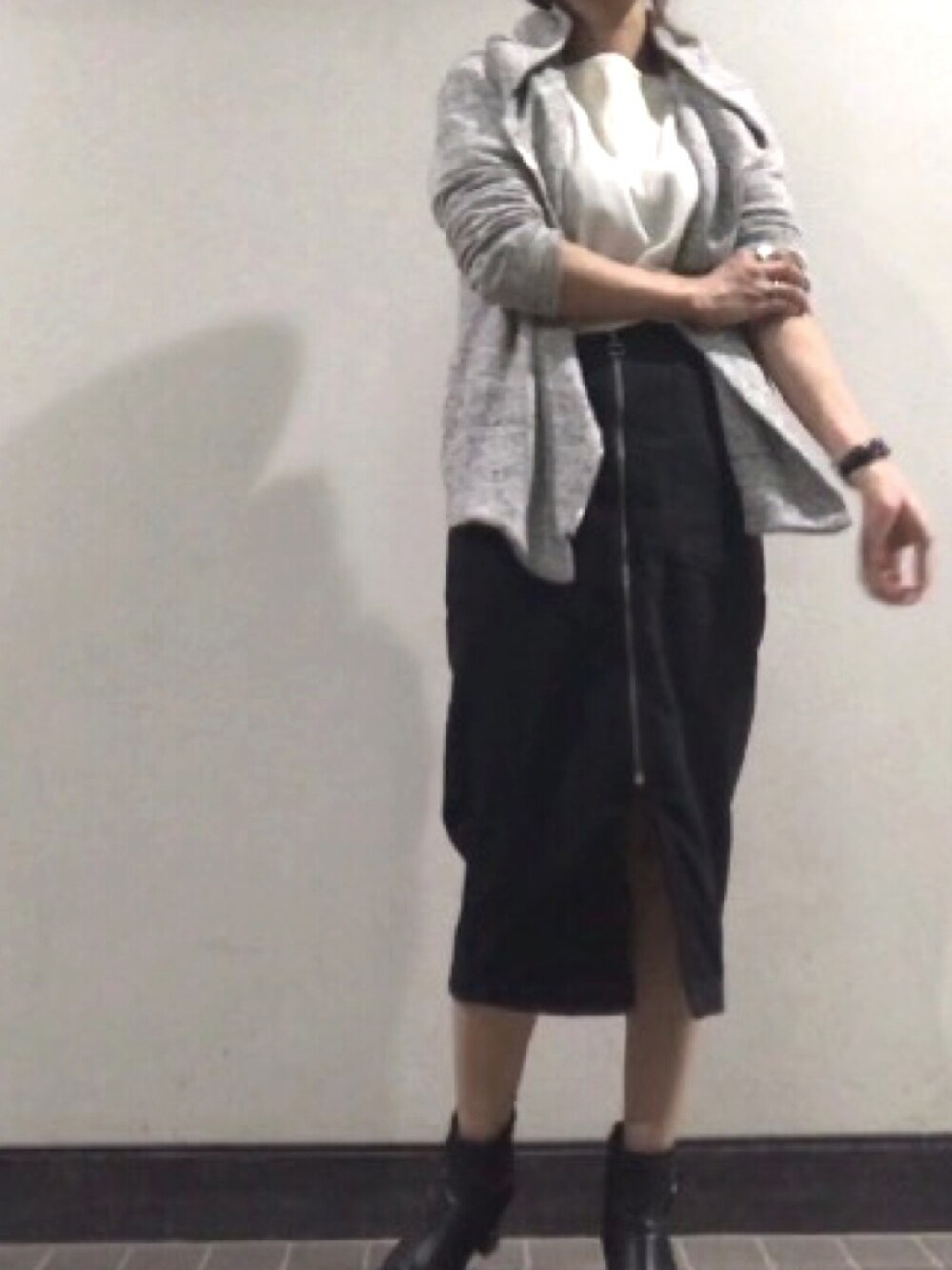 この前の急に気温下がって 土砂降りの日 友人を空港へ送りに行った時のコーデ 雨なので、ブーツ👢 と 足元濡れるの嫌だから スカート このタイトスカート 妹に勧められて、なんとなく買ってみたけど スゴく使える! 体重増えてからというもの 足出すのも嫌でロングスカート派 ↑いや...これは昔からか 笑 スキニーパンツも履きたくなくて ずーっとワイドパンツばかりで飽き飽きしてたけど、 これは 買ってよかったー🙌 それにしても画像悪いな...