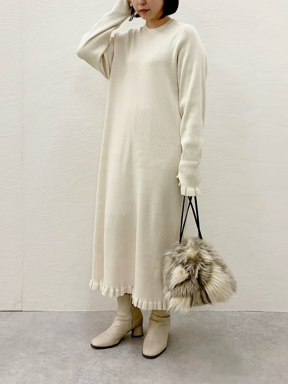 ご覧頂きありがとうございます☺︎ 今日はホワイトコーデ。 袖口と裾のフリルに一目惚れした リブニットワンピースに 同じトーンのミックスファー巾着をポイントに💡 白いニットワンピを初めて買ったので 自分の姿を見るたびに 少しこそばゆくなる1日でした😆