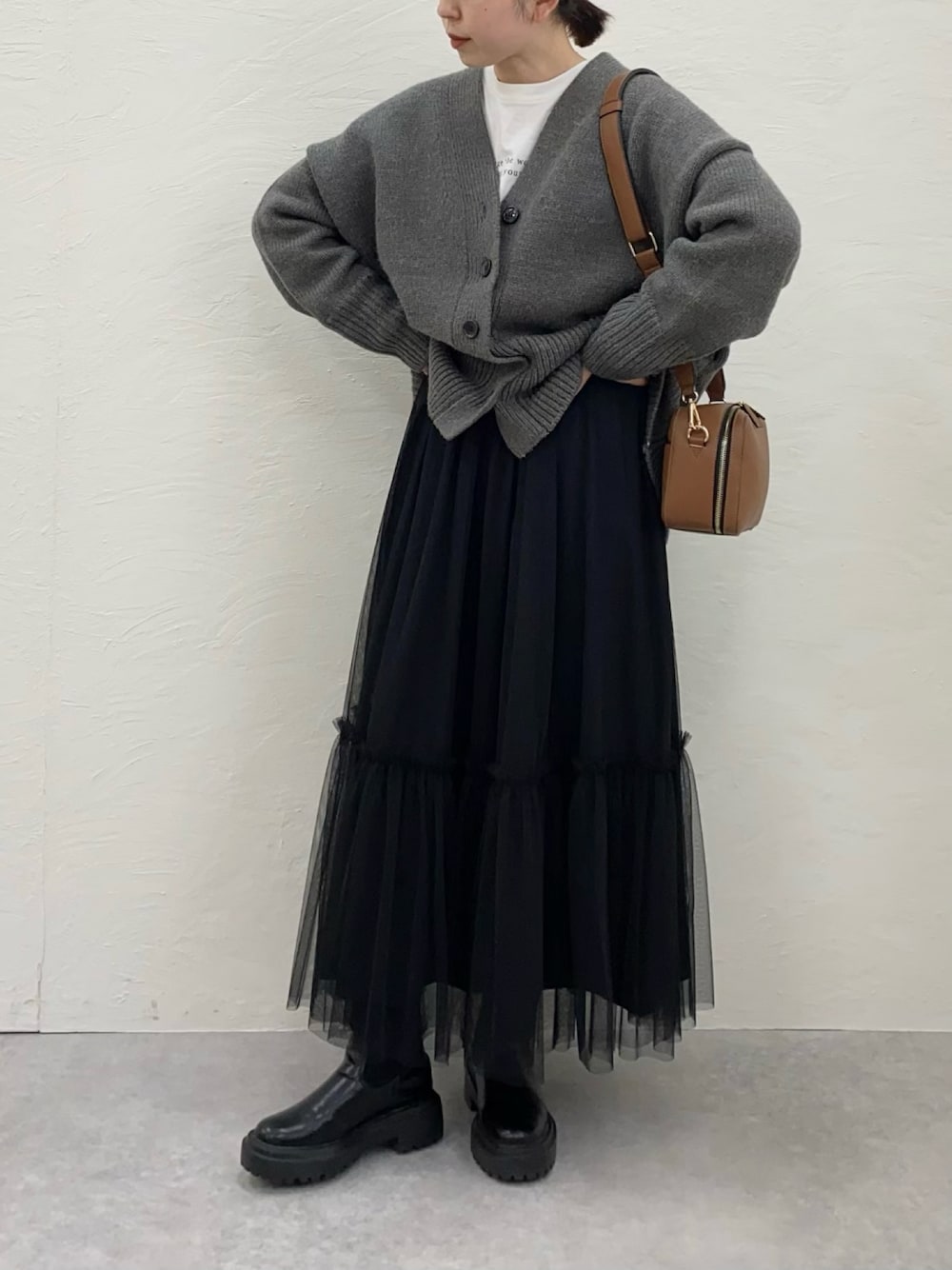 ご覧頂きありがとうございます☺︎ 今日はオトナのガーリーコーデ。 合わせたショルダーバッグは 落ち着いた色味のブラウンなので モノトーンコーデにも合わせやすいです♪ たっぷりマチ付きなので 見た目以上に荷物がたくさん入ります!