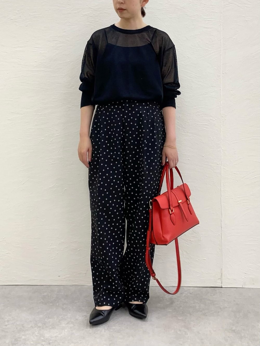 ご覧頂きありがとうございます♪ 今日のバッグはお気に入りの赤いバッグ🍎 モノトーンコーデに映えます✨ ドット×赤ってとってもかわいい♡