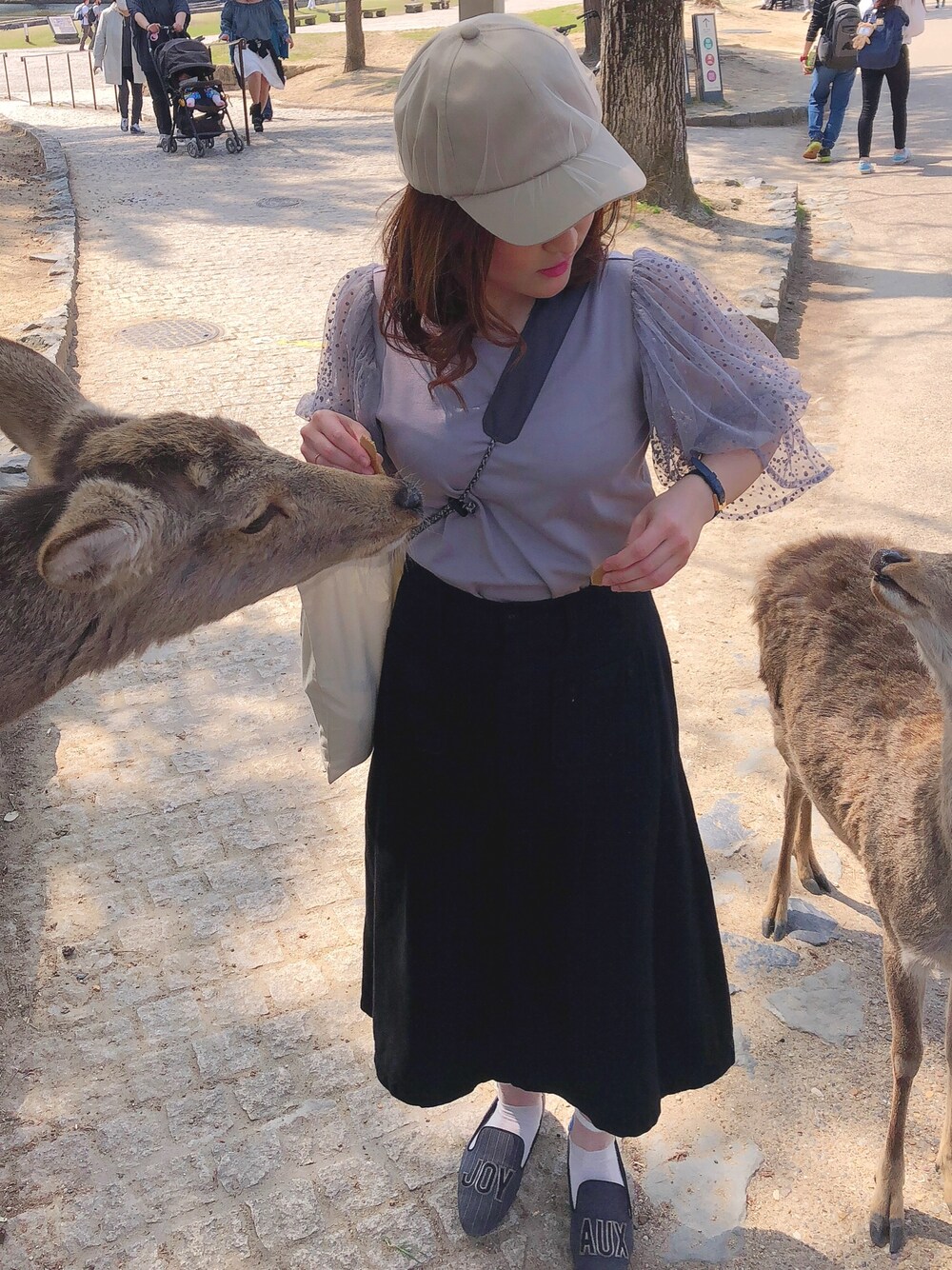 奈良へお花見に行ってきました! 葉桜だったけど天気もよくて、 鹿さんと戯れて充実した休日でした☺︎︎ 25°だとシースルーで丁度良い!!