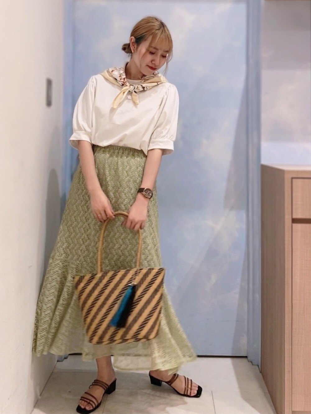 ご覧いただきありがとうございます🦊 初夏にピッタリなバルーンスリーブのカットソーは袖丈が長めなので今から着まわせる優れものです! スカーフをプラスしてレトロかわいい雰囲気にしてみました🕊𓂃 𓈒𓏸◌