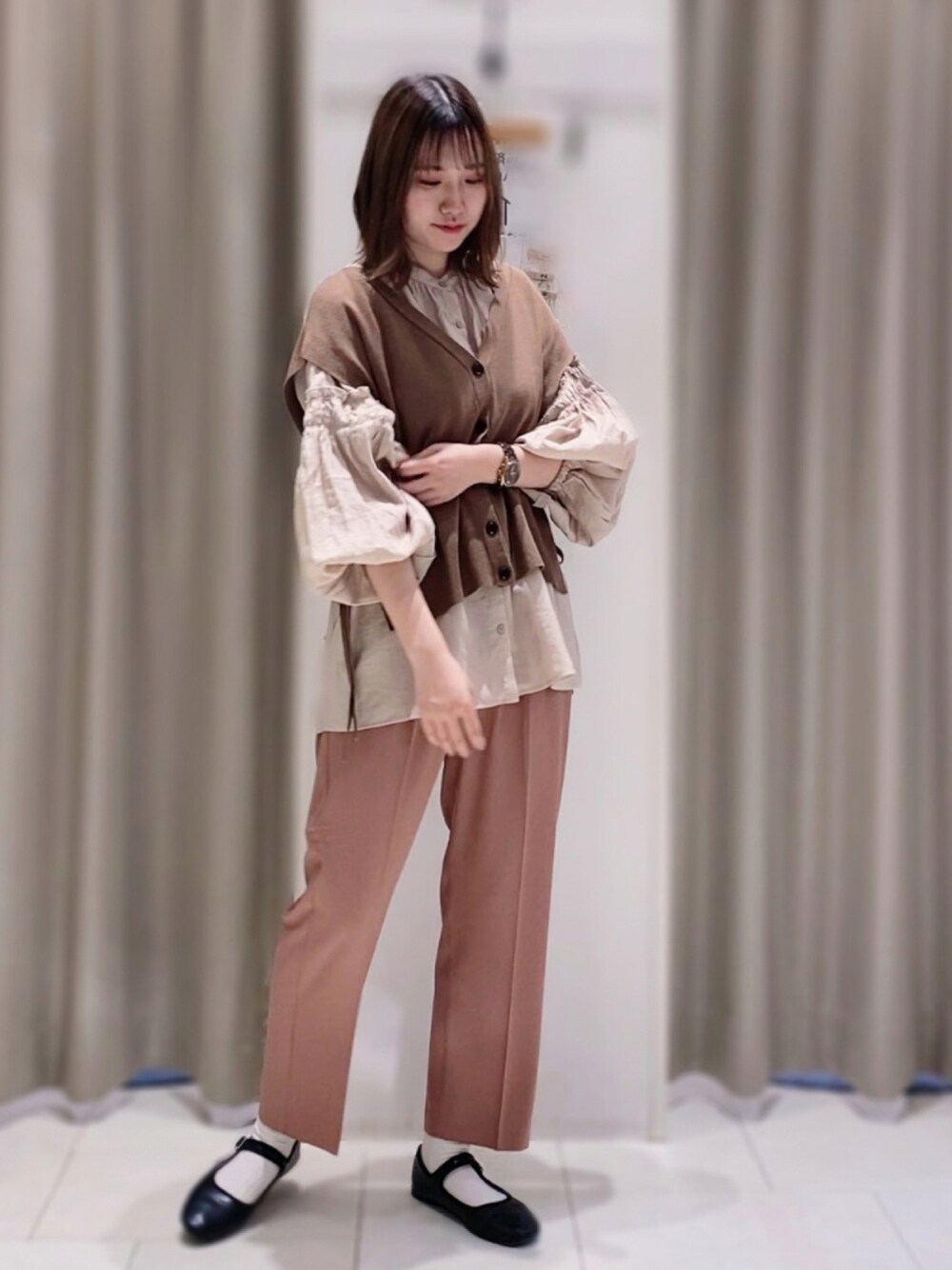 ご覧頂きありがとうございます🙏🏻´- 秋のブラウンコーデです🧸𓂃 𓈒𓏸◌ ボリュームたっぷりのブラウスは袖の切り返しがフリルになっていてとっても可愛いです!前後2wayのベストと合わせて着回しも◎ 同系色のくすみピンクですが、パンツなので甘すぎない印象に! ベージュやブラウン系大好きなので四季の中で秋服が1番ストライクです🍁🍄