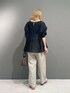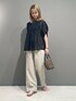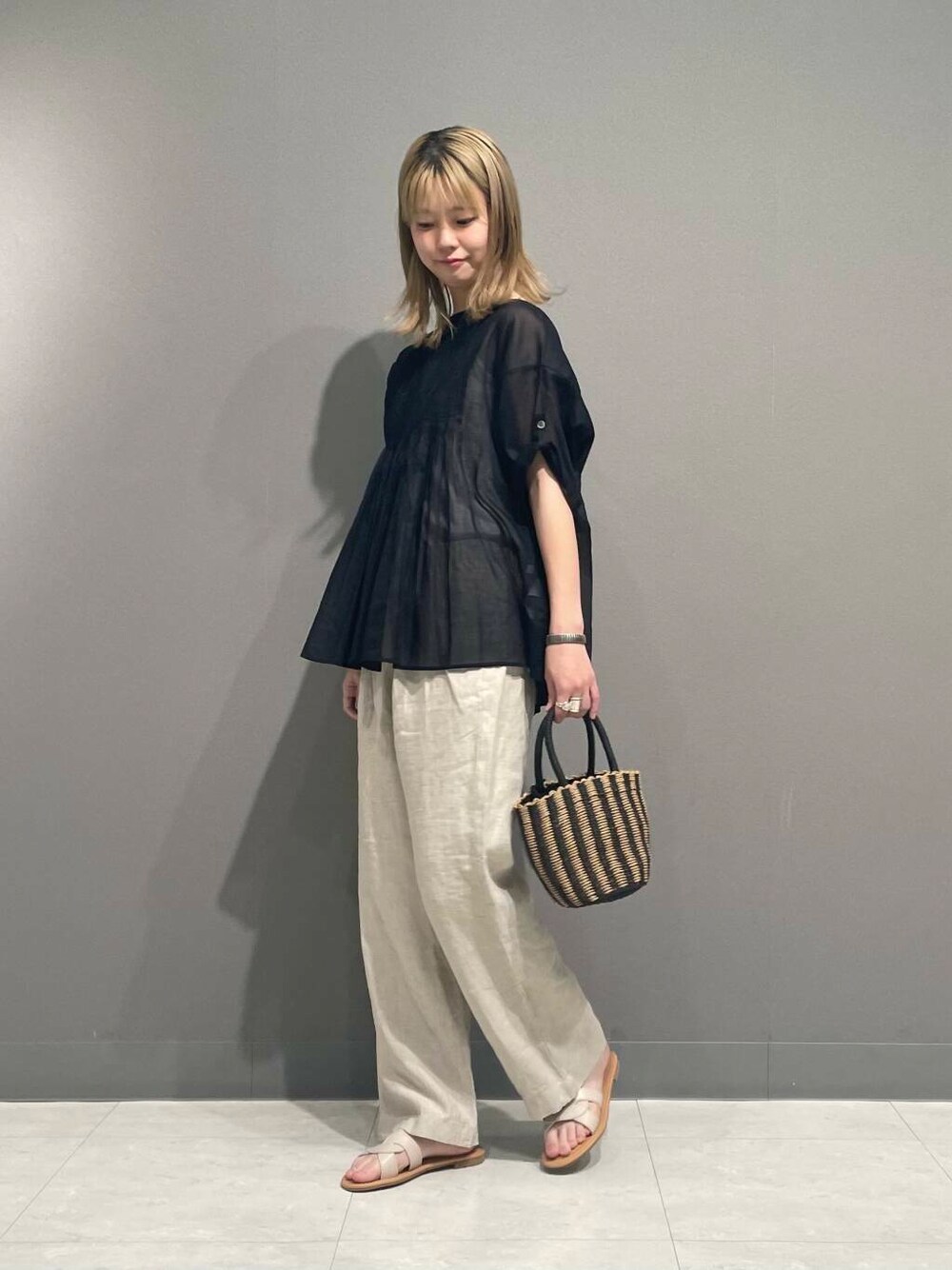 ブラウスのシアー感とリネンの涼しげな組み合わせで夏にピッタリのコーディネートです! 着心地ゆったりで暑い夏には嬉しいアイテム◎