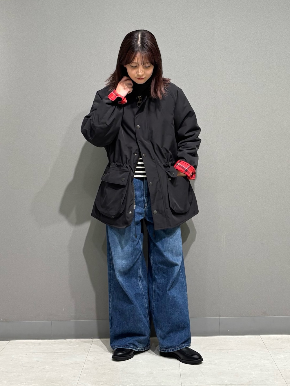 Barbour×DOORSの別注商品のご紹介! 中綿が入ったジャケットなので一枚で真冬まで着まわせるアイテム◎ 撥水素材のため雨の日でも着用いただけます✨ 黒ボーダーとチェックの柄×柄の組み合わせ可愛くておすすめです✔︎