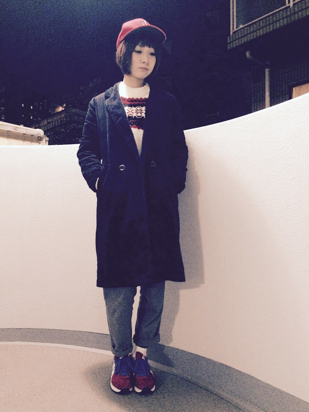 古着のニットにコーデュロイのコート! グレーのパンツですっきりとまとめました。 赤の帽子と靴をアクセントに。