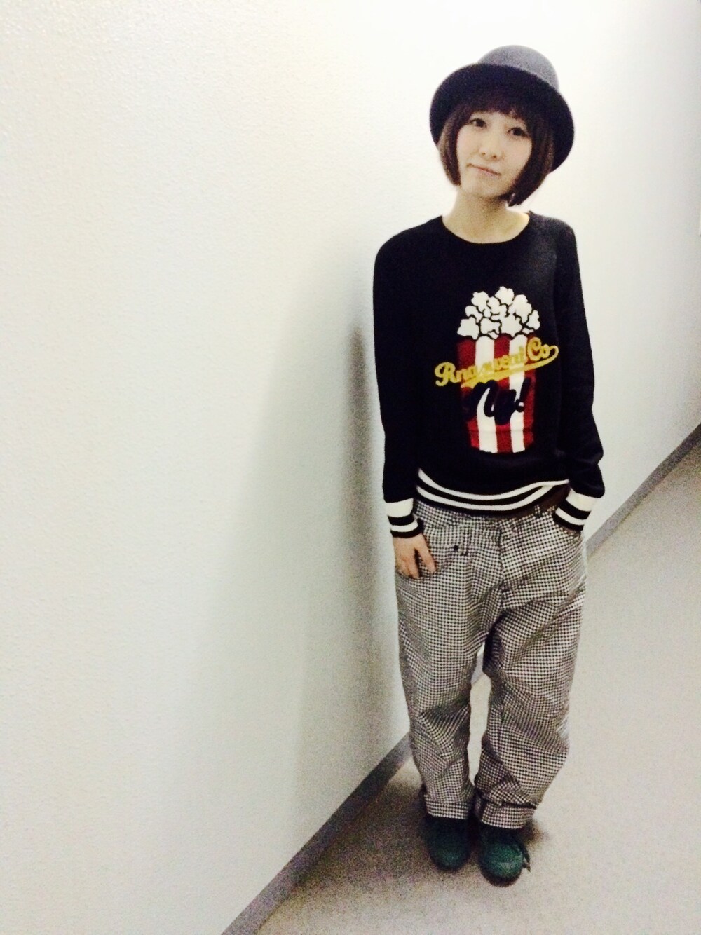 全体的にモノトーンでまとめました! ニットの柄と緑のクツがアクセント♡