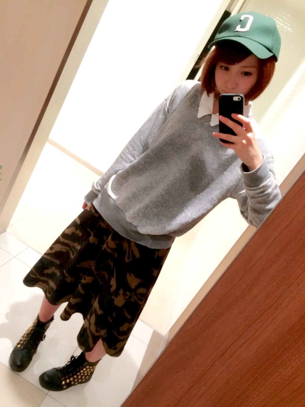 ウォッシュ加工のスウェットにガーリーなつけ襟♡ カモフラ柄のスカートにグリーンのキャップを合わせて♡ 靴はあえてのスタッズ付きブーツ!