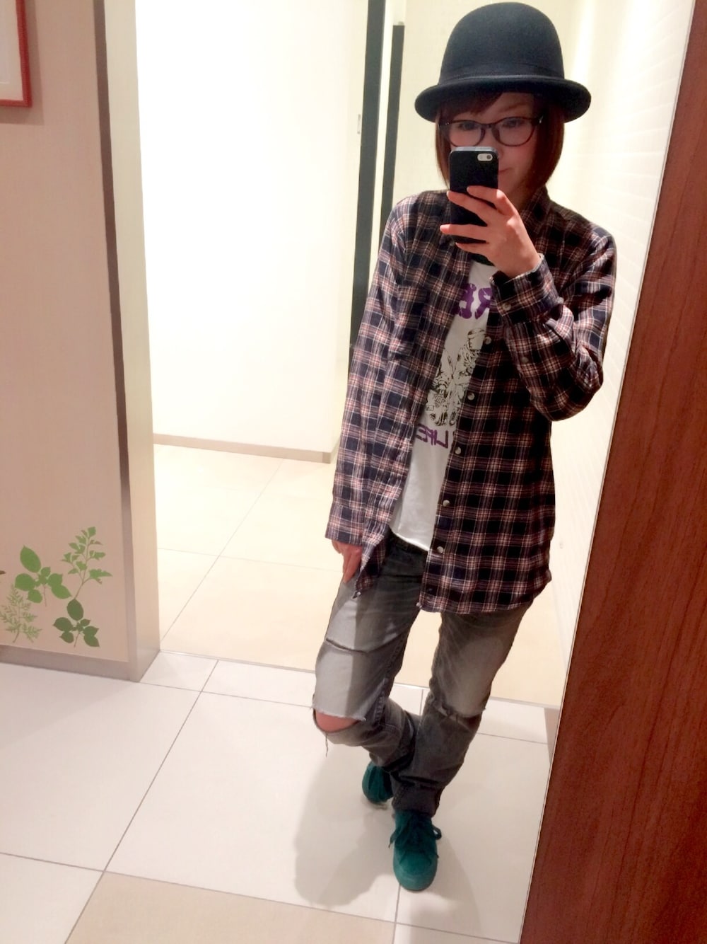 ロング丈のネルシャツにダメージデニムでラフに!と思ったけどハットをかぶってみました♡ メガネもポイント♡