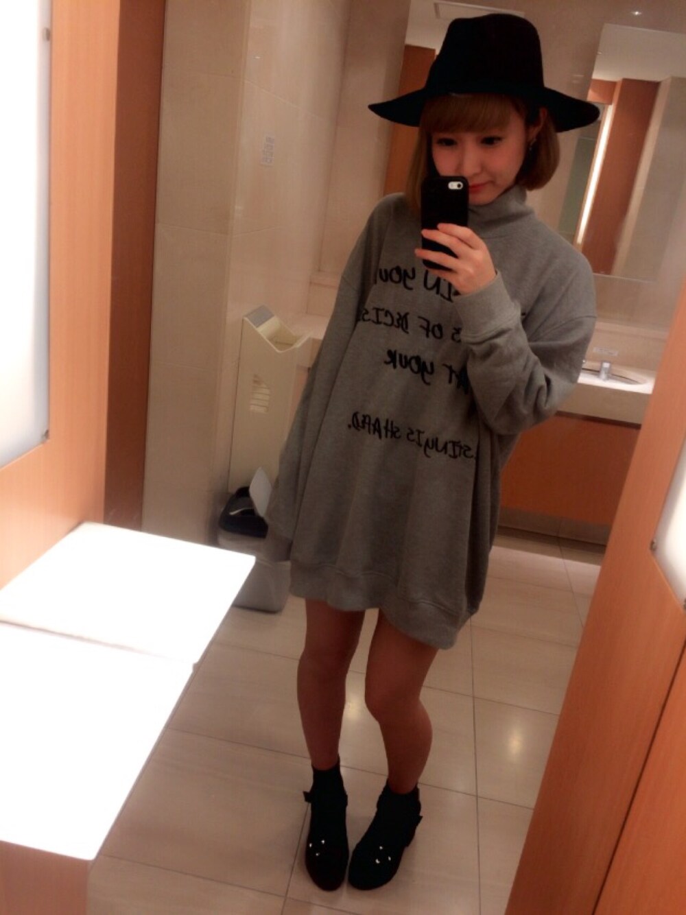 ハイネックのスウェットワンピに黒のつば広ハットでシンプルコーデ♡ 靴下にサンダルもポイント!