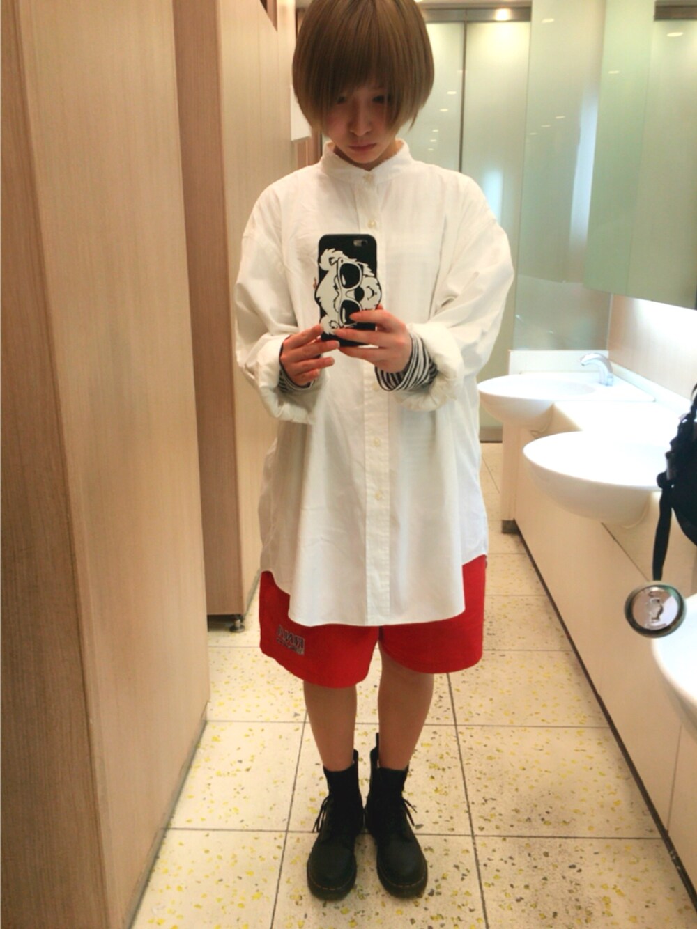 古着のオーバーサイズシャツにスポーティな短パンを合わせたシンプルコーデ😶 袖口からチラッと見えるボーダーがポイント♡