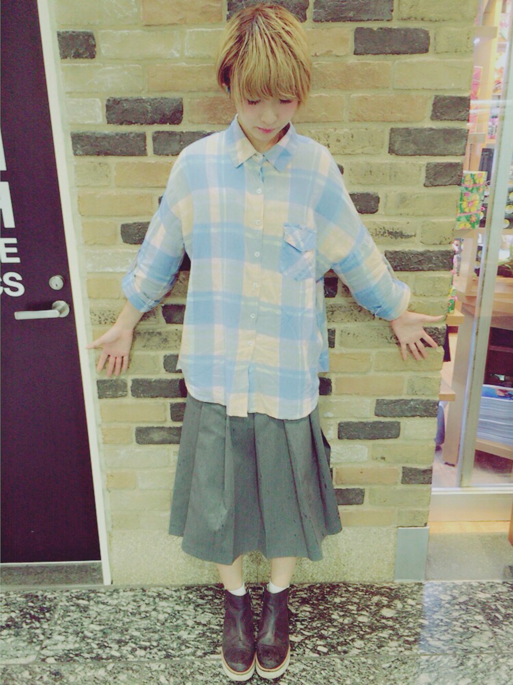 雨の日気分は晴れやかにー😁 少しゆったりしたパステルカラーのチェックシャツにグレーの膝下丈プリーツスカートでガーリーなゆるコーデ♡